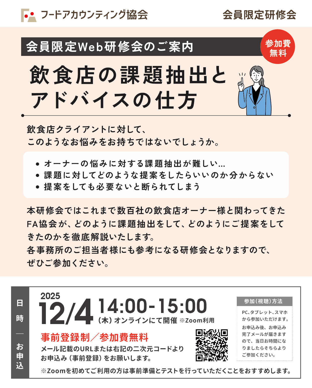 ①2023年の飲食業界の動向と見通し ~中小規模の飲食店に必要とされる戦略について~ ②新規顧問先開拓について ~飲食業界の可能性と契約に繋げるポイントについて~ |
